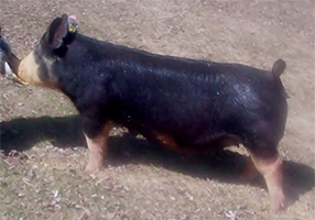 Littermate to the Champion Gilt at the 2013 Fall Classic, this powerful female puts together a lot of the positives that we are trying to build a sow herd around. Sue Ellen exemplifies mass, power, body and bone while still looking like a female. Stout-skulled, big footed and big topped are a few more traits that describe this Berkshire beauty. No question she will be a generator for us for a while. Her offspring's combination of look and power will have a lot of the competition beat before the show even starts! |